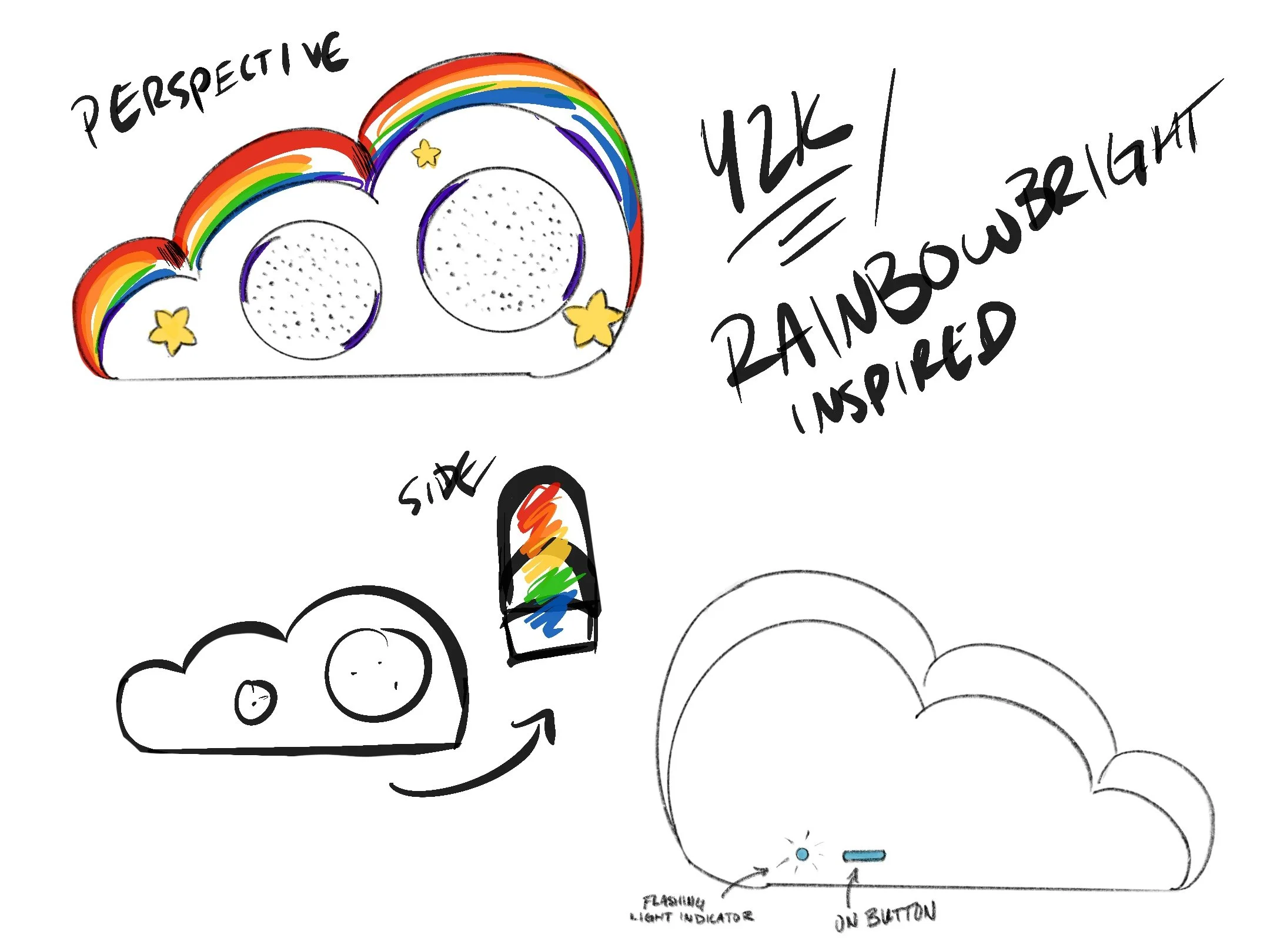 The Cloud9 Radio is a Y2K and Lisa Frank–inspired children’s radio that blends nostalgic charm with modern technology. Handcrafted in a whimsical cloud form, it features an iridescent rainbow stripe and two playful squishy stars — the purple star acts as the power switch, while the blue star offers a tactile element for interaction.